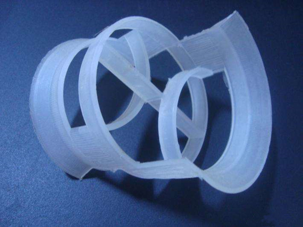 共軛環(huán)結(jié)合了環(huán)形和鞍形填料的優(yōu)點(diǎn),采用共軛曲線肋片結(jié)構(gòu),兩端外卷邊及合適的長徑比,填料間或填料與塔壁間均為點(diǎn)接觸,不會(huì)產(chǎn)生疊套。孔隙均勻,阻力小,亂堆時(shí)取定向排列